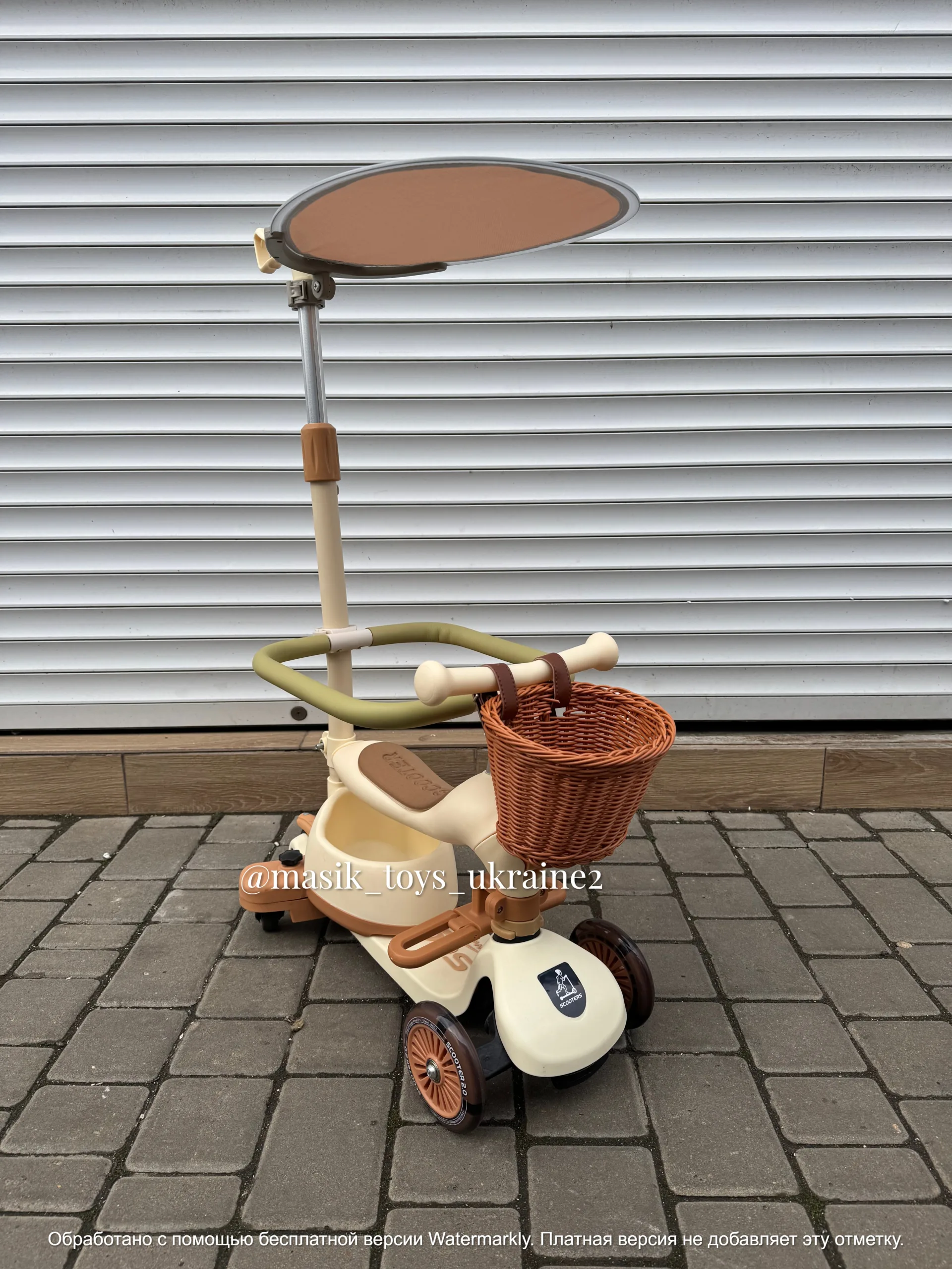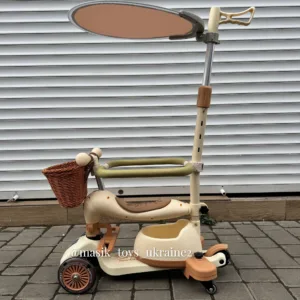 Дитячий самокат 3в1- універсальний транспорт для дітей з сидінням, козирком та батьківською ручкою, який поєднує в собі функції самоката та толокара, оснащений знімним захисним бортиком, що гарантує безпеку найменших користувачів.