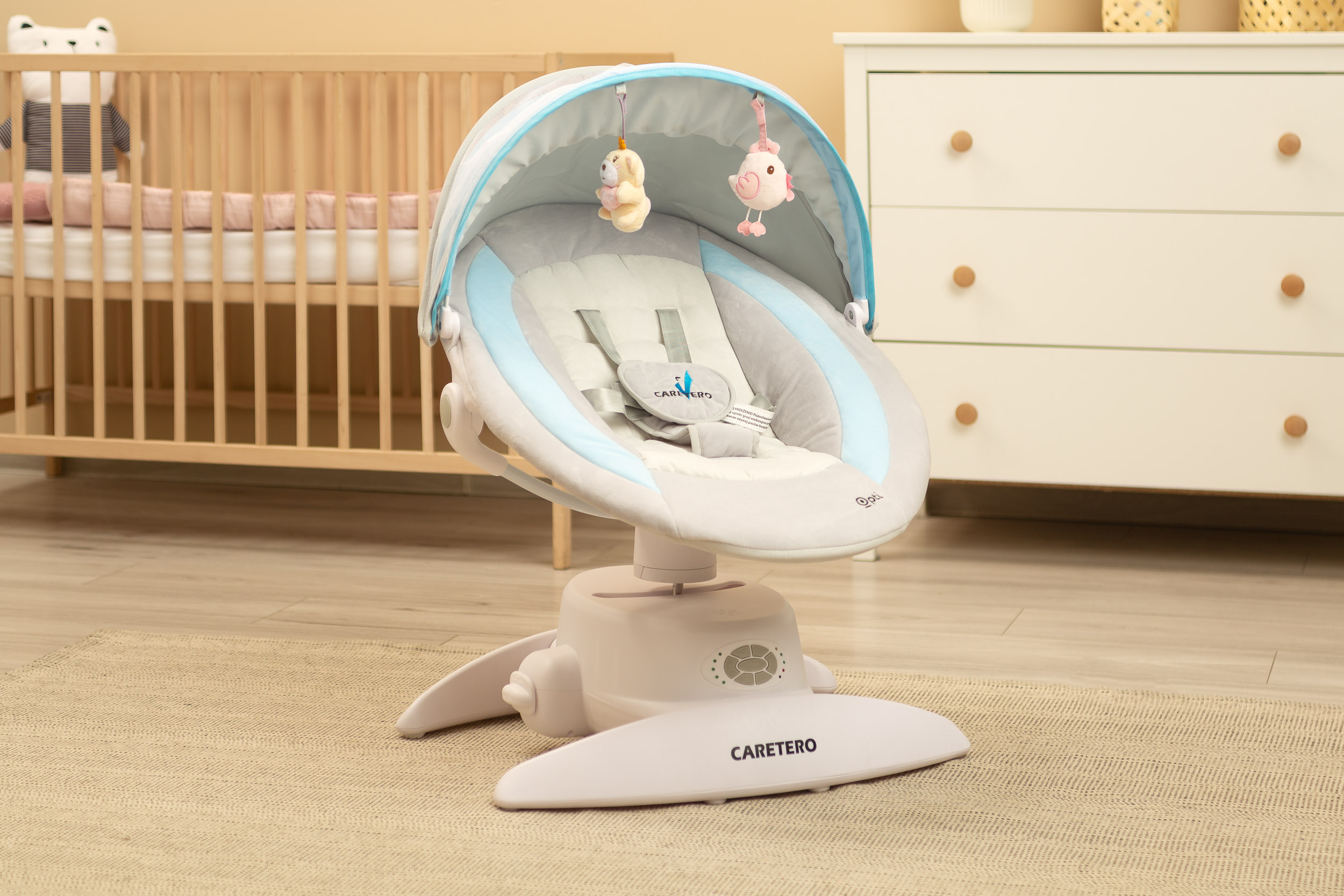 – три режими роботи: OPTI пропонує три різні режими гойдання, включаючи гойдання задньої частини шезлонга, розгойдування всього шезлонга та розгойдування передньої частини шезлонга, забезпечуючи різноманітні та персоналізовані розваги для малюка