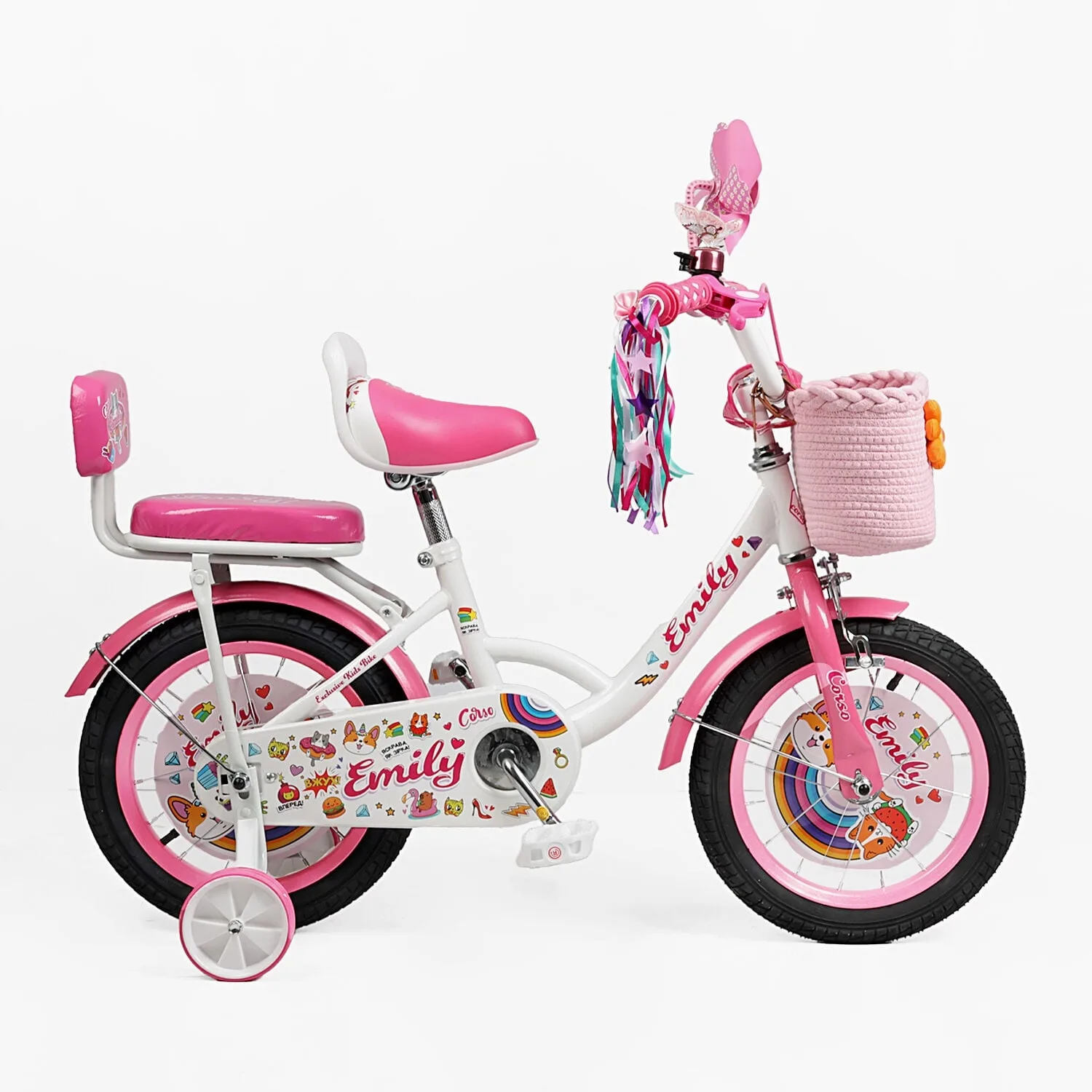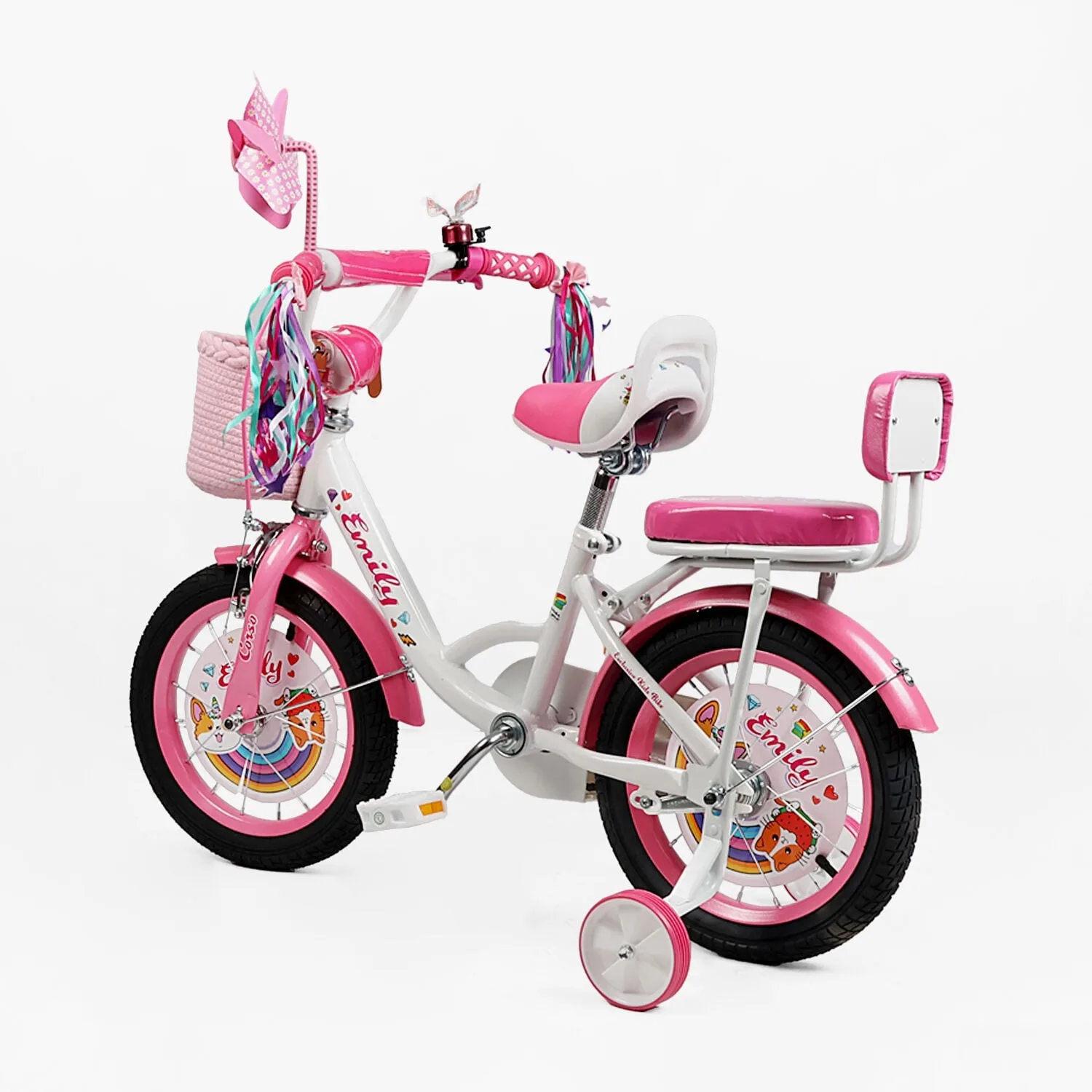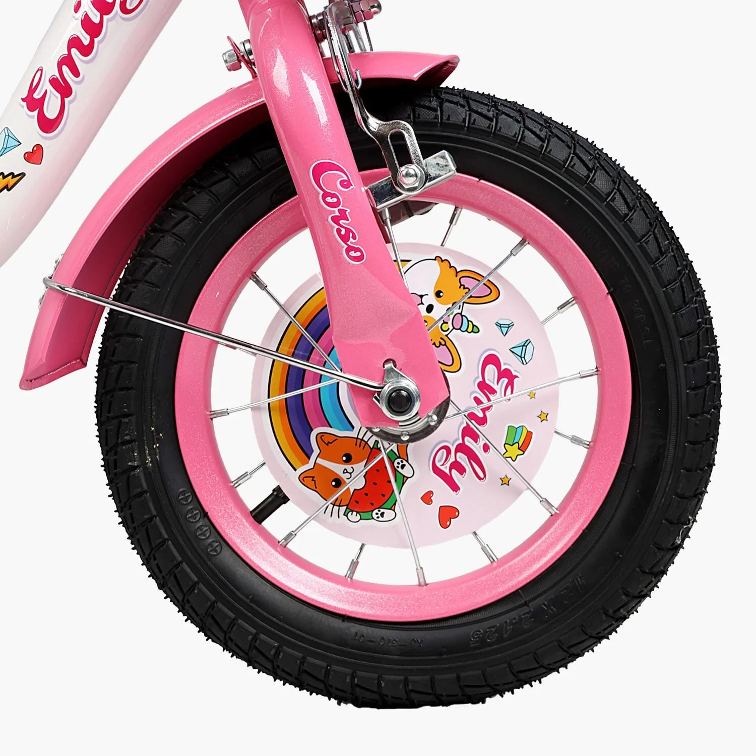 Колеса Corso Emily з надувною камерою на металевих дисках зі спицями. Над кожним колесом встановлені крила з металу. Вони допоможуть запобігти розбризкуванню бруду і води та захистять дитину і сам велосипед від забруднень.