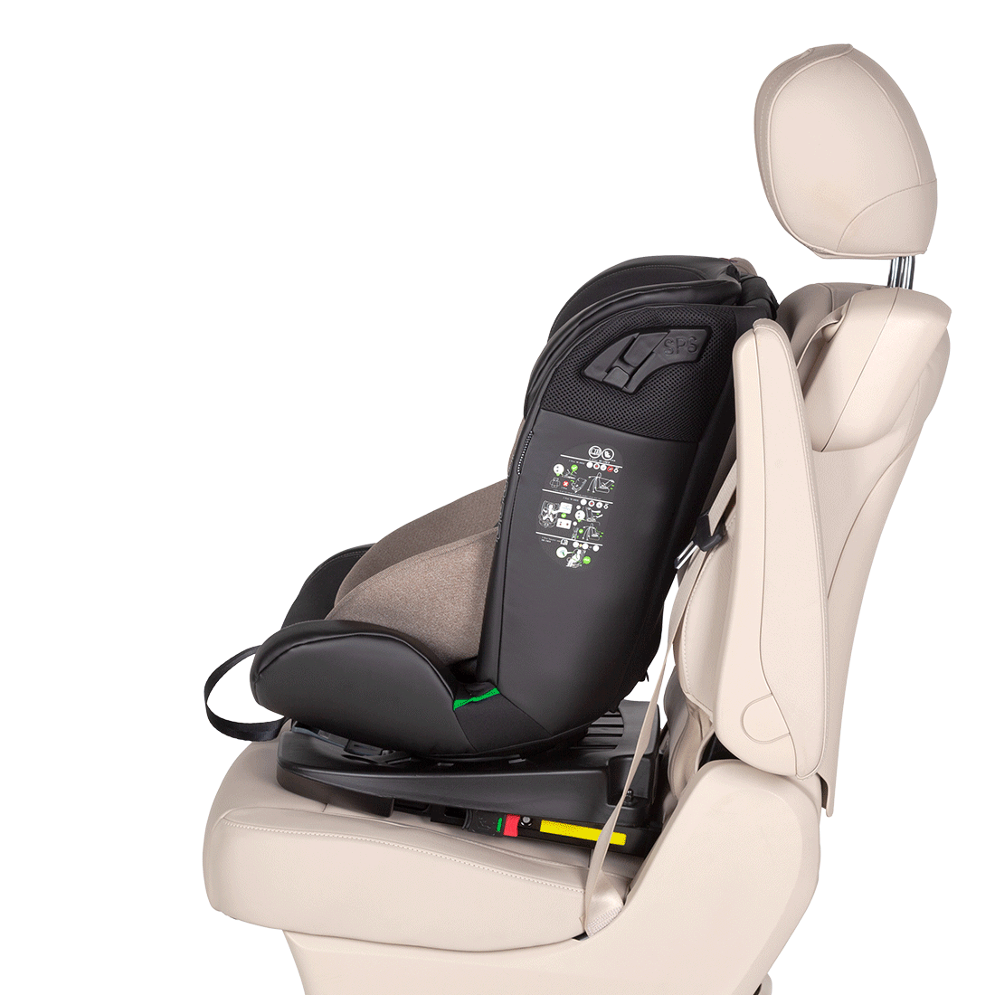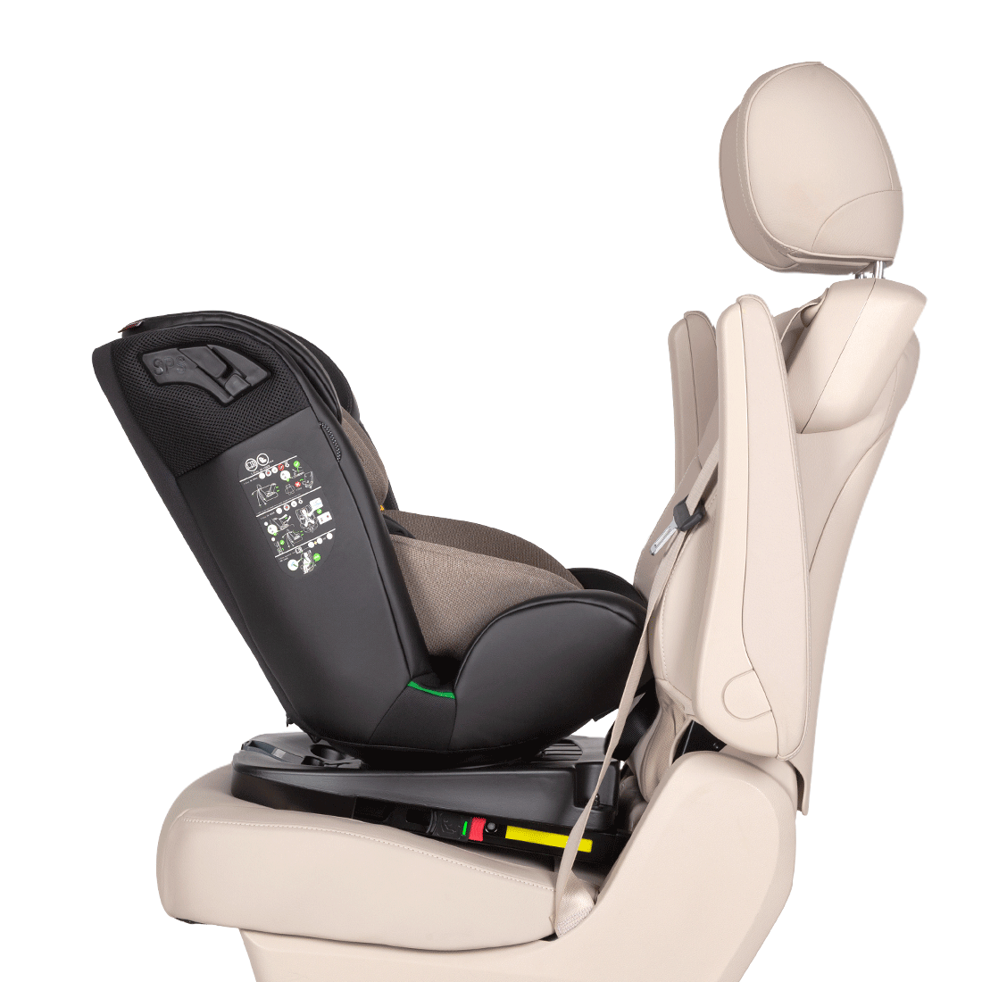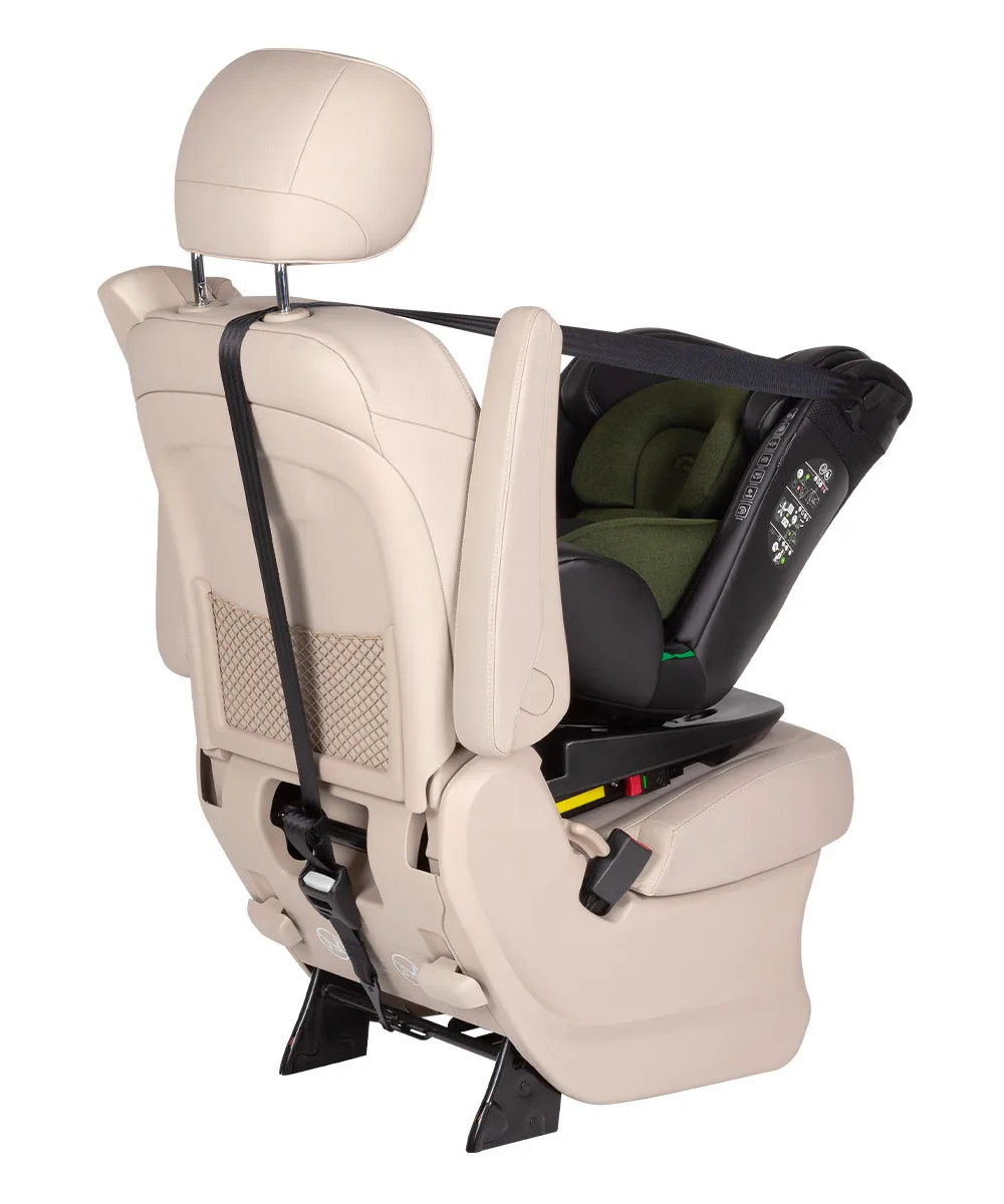 Оснащене захистом від бокових ударів, системою кріплення Isofix, Top Tether (якірний ремінь) і обертанням на 360°. Додатковий фіксатор ременів безпеки.