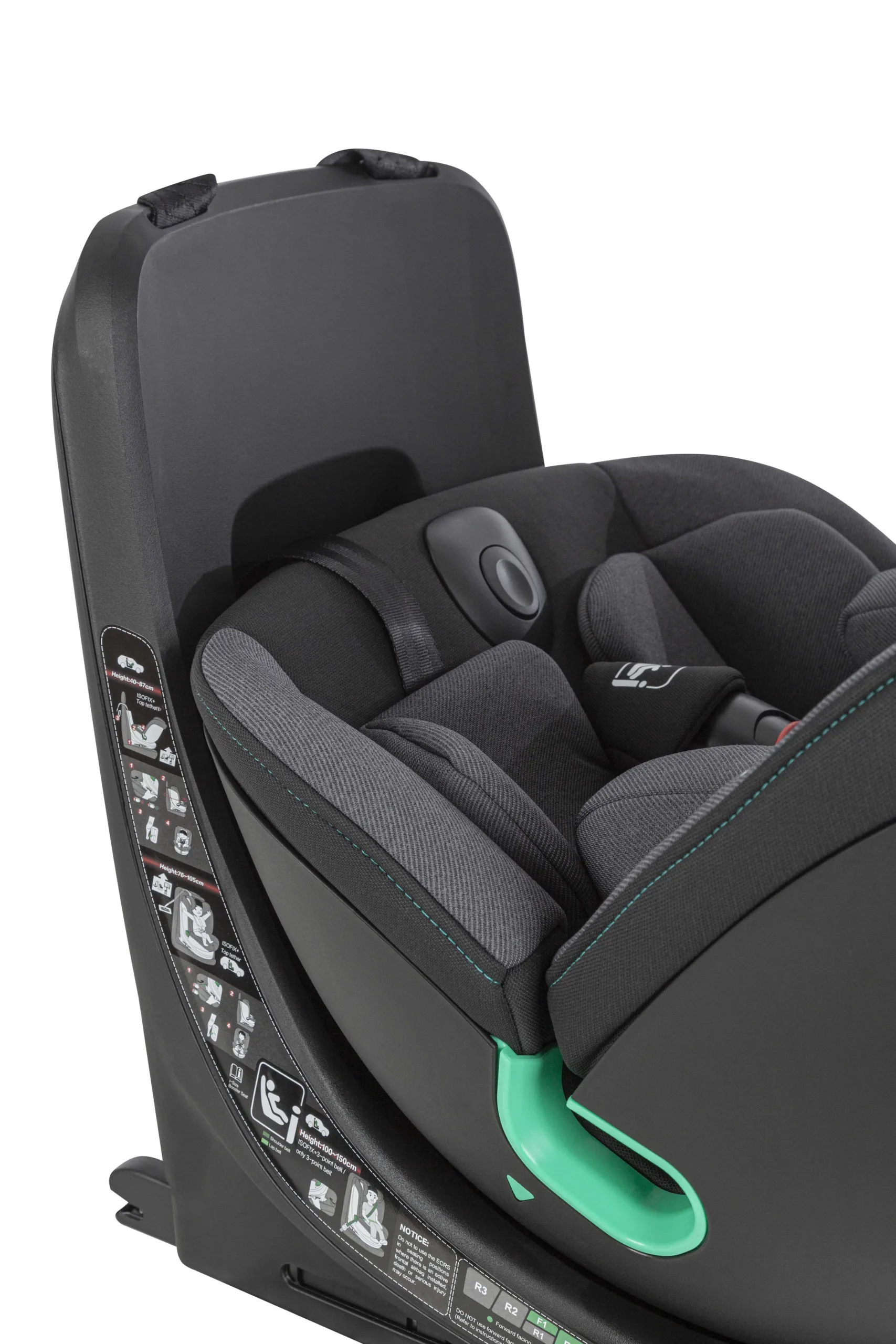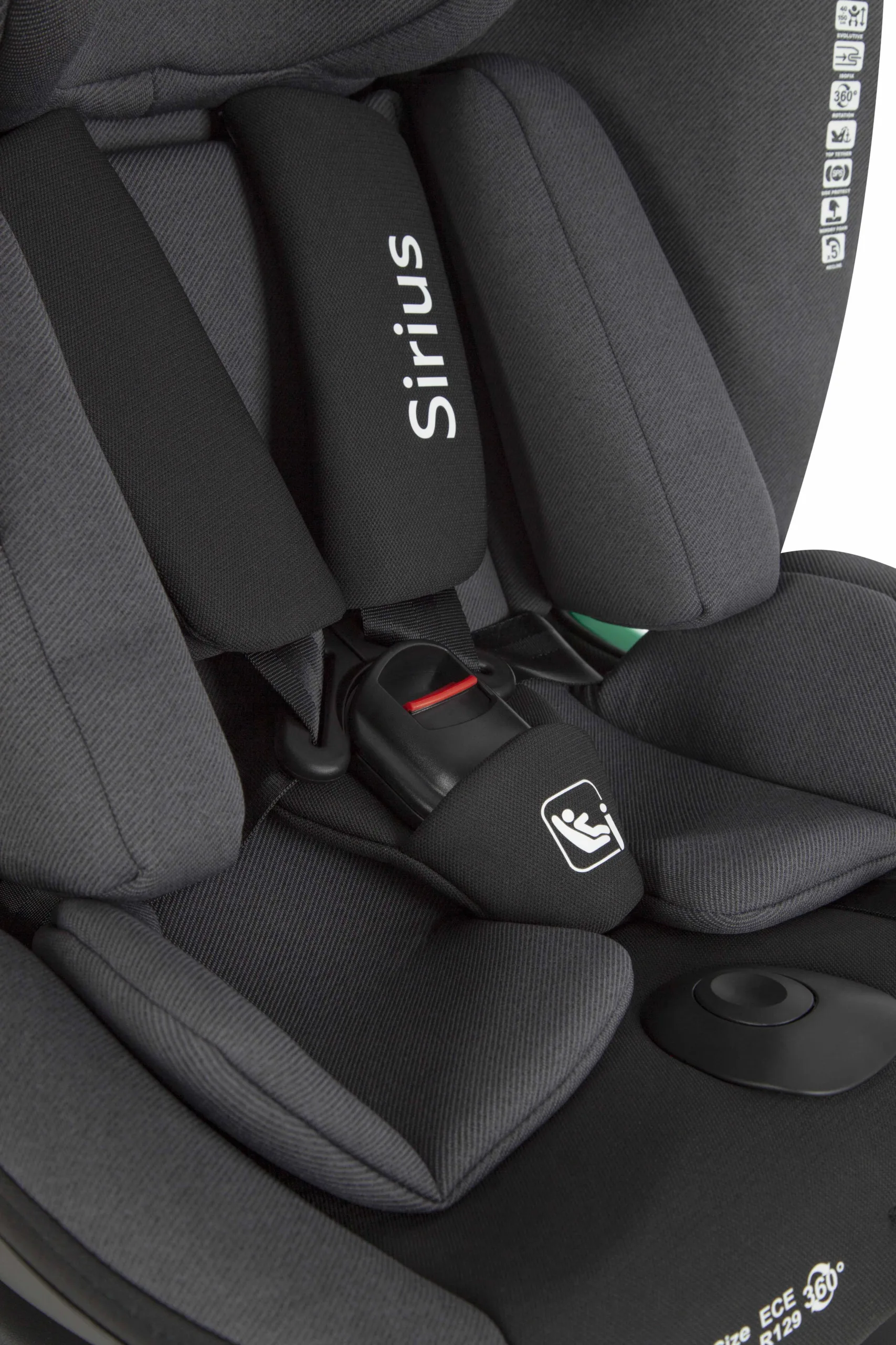 Ремінь Top Tether для надійної фіксації крісла. У комплекті анатомічна вкладка з підголівником. Трикутна подушка використовується до 60 см, вкладиш – до 75 см зросту дитини. Поворот на 360° забезпечить легку зміну напрямку сидіння, а також комфортну посадку маленького пасажира. Від 75 до 150 см зросту дитини встановлюється по ходу руху авто.