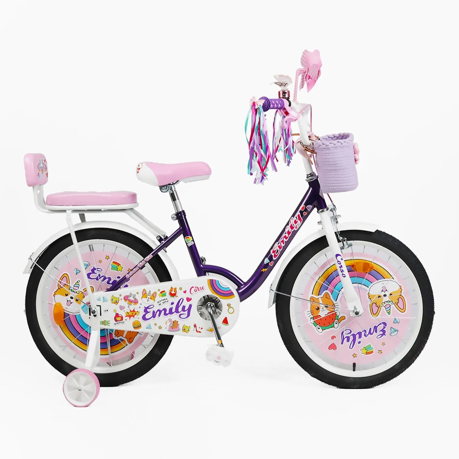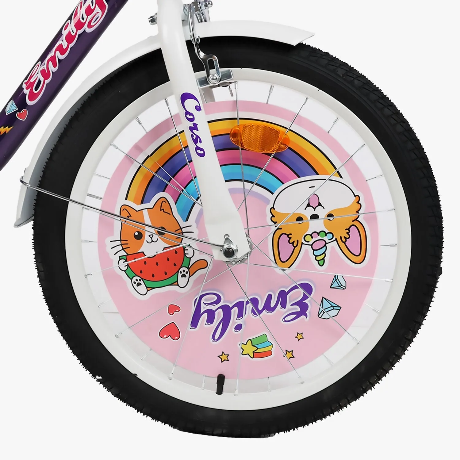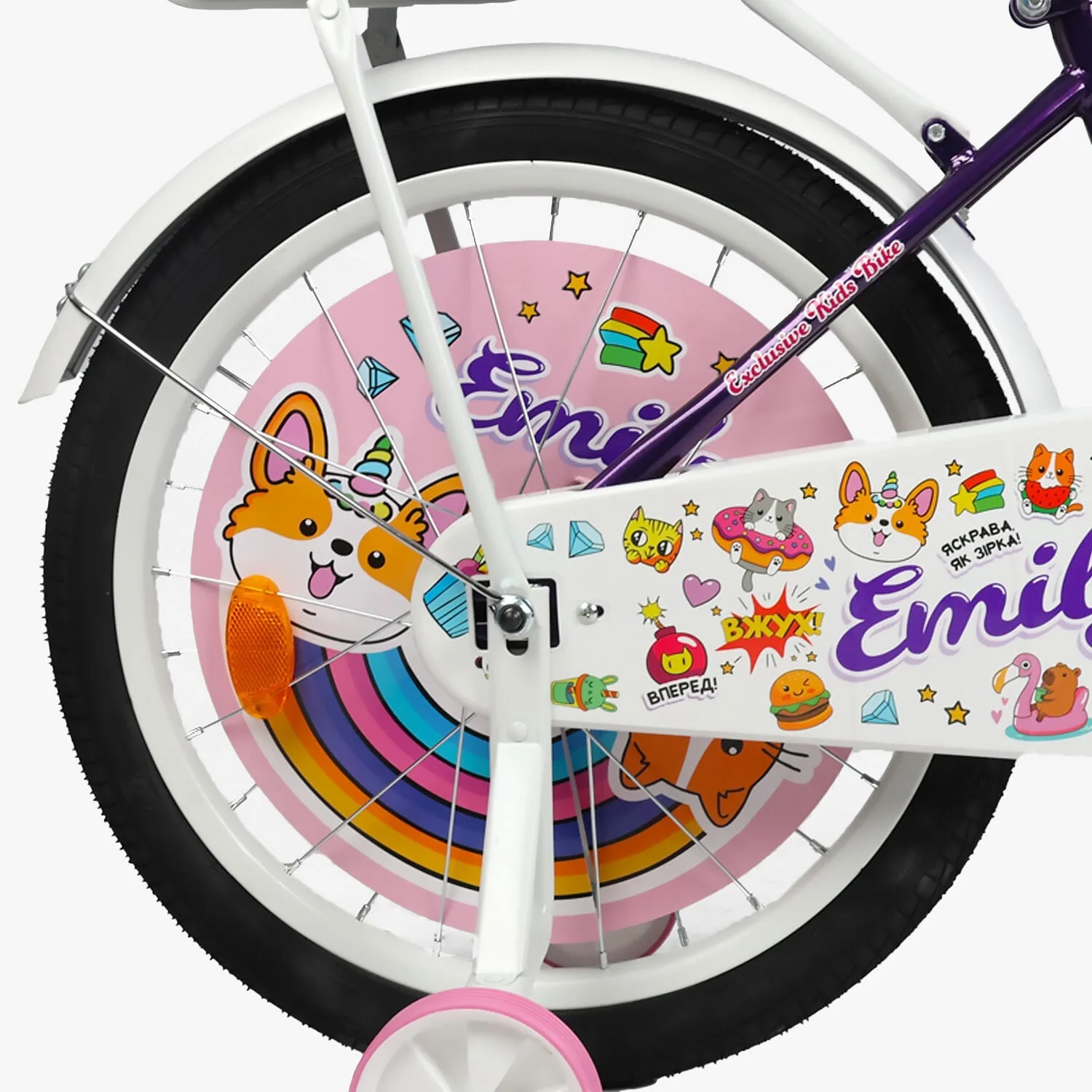 Колеса Corso Emily з надувною камерою на металевих дисках зі спицями. Над кожним колесом встановлені крила з металу. Вони допоможуть запобігти розбризкуванню бруду і води та захистять дитину і сам велосипед від забруднень.