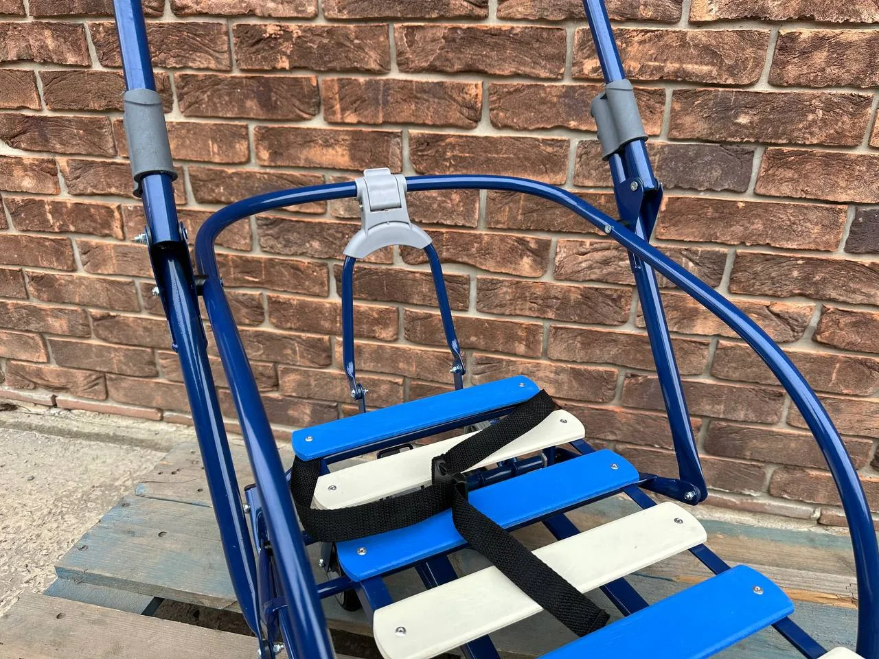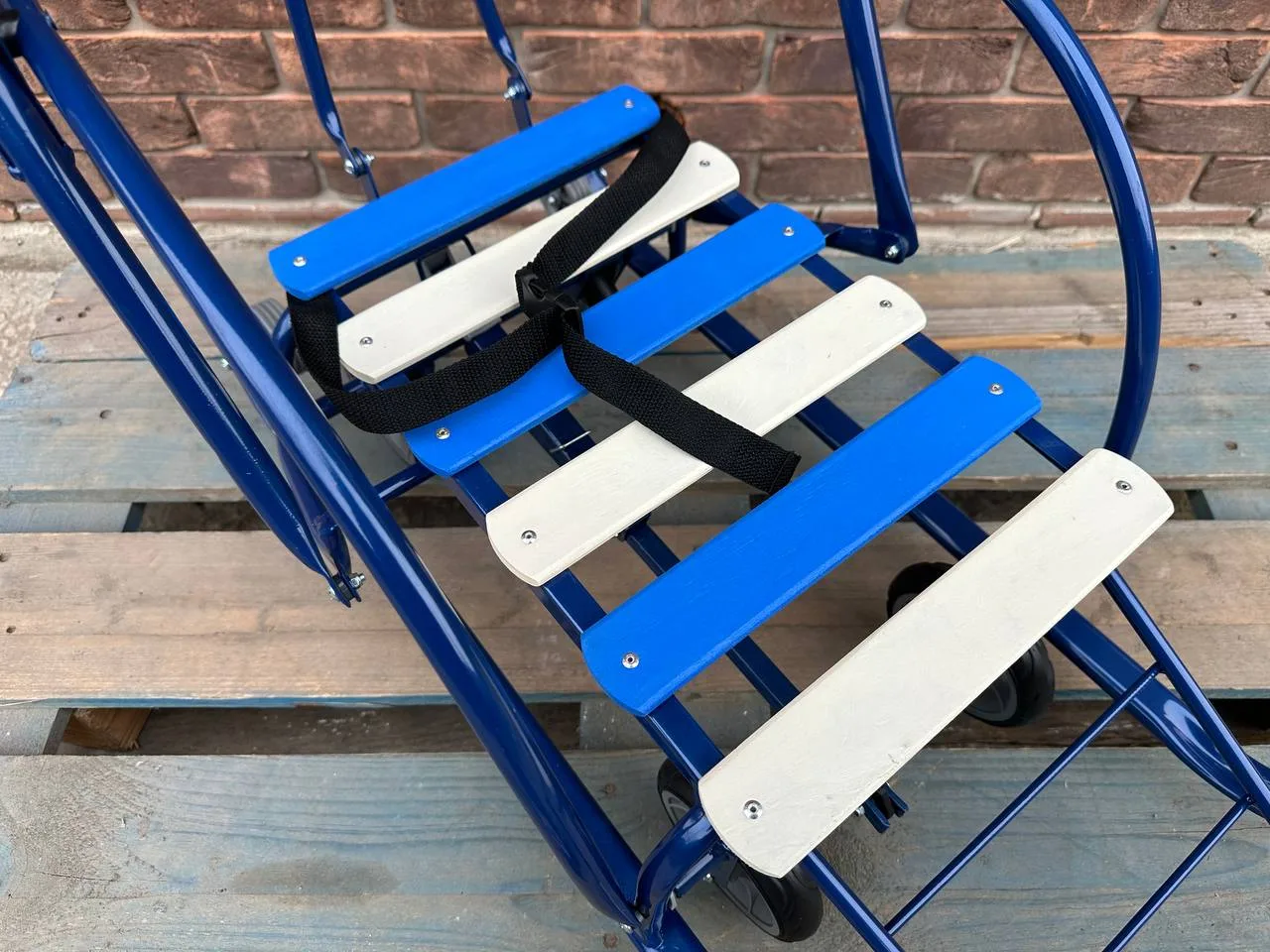 ◾️Матеріал: каркас – метал; сидіння – дерев’яні рейки; ремінь безпеки – ремінна стрічка